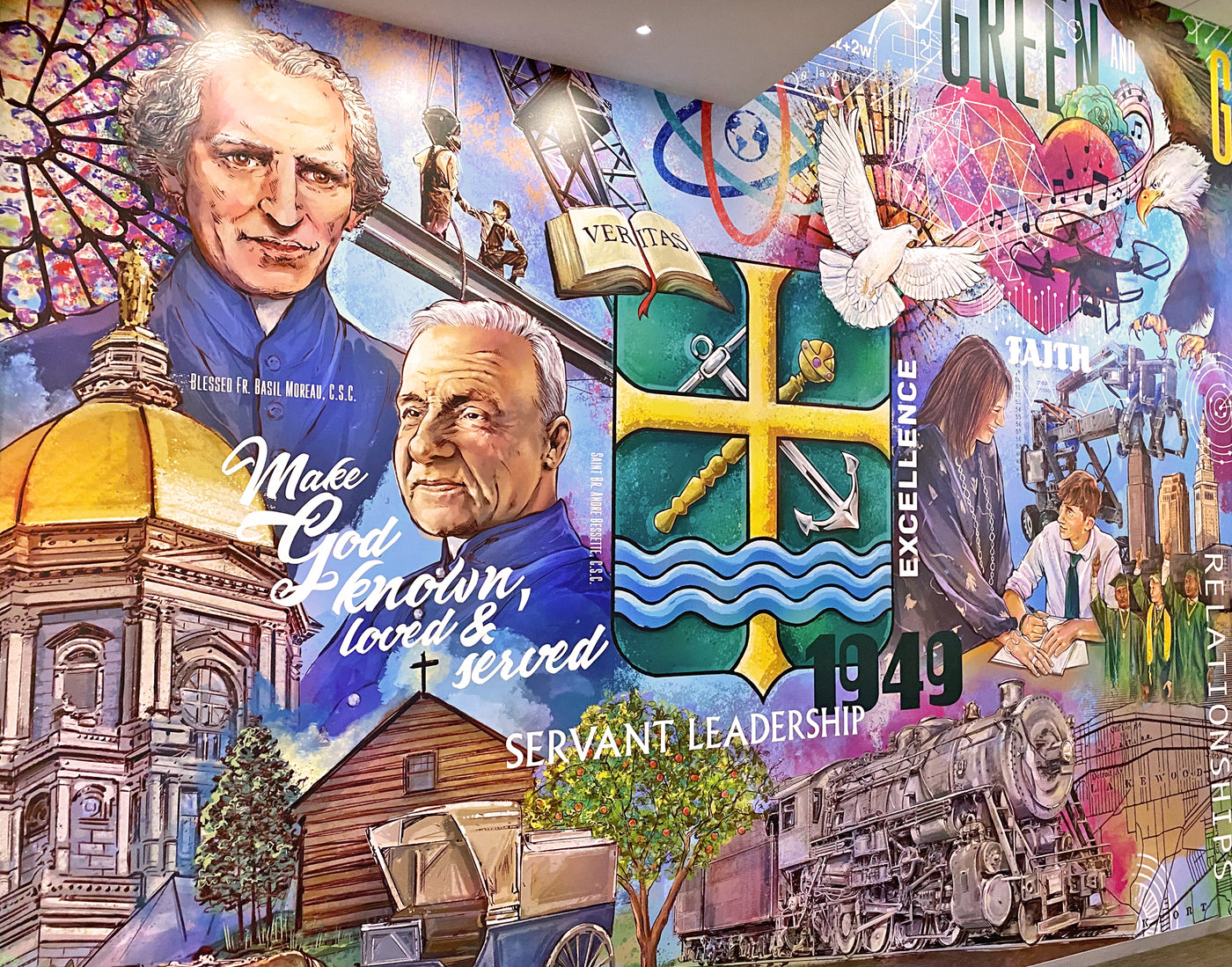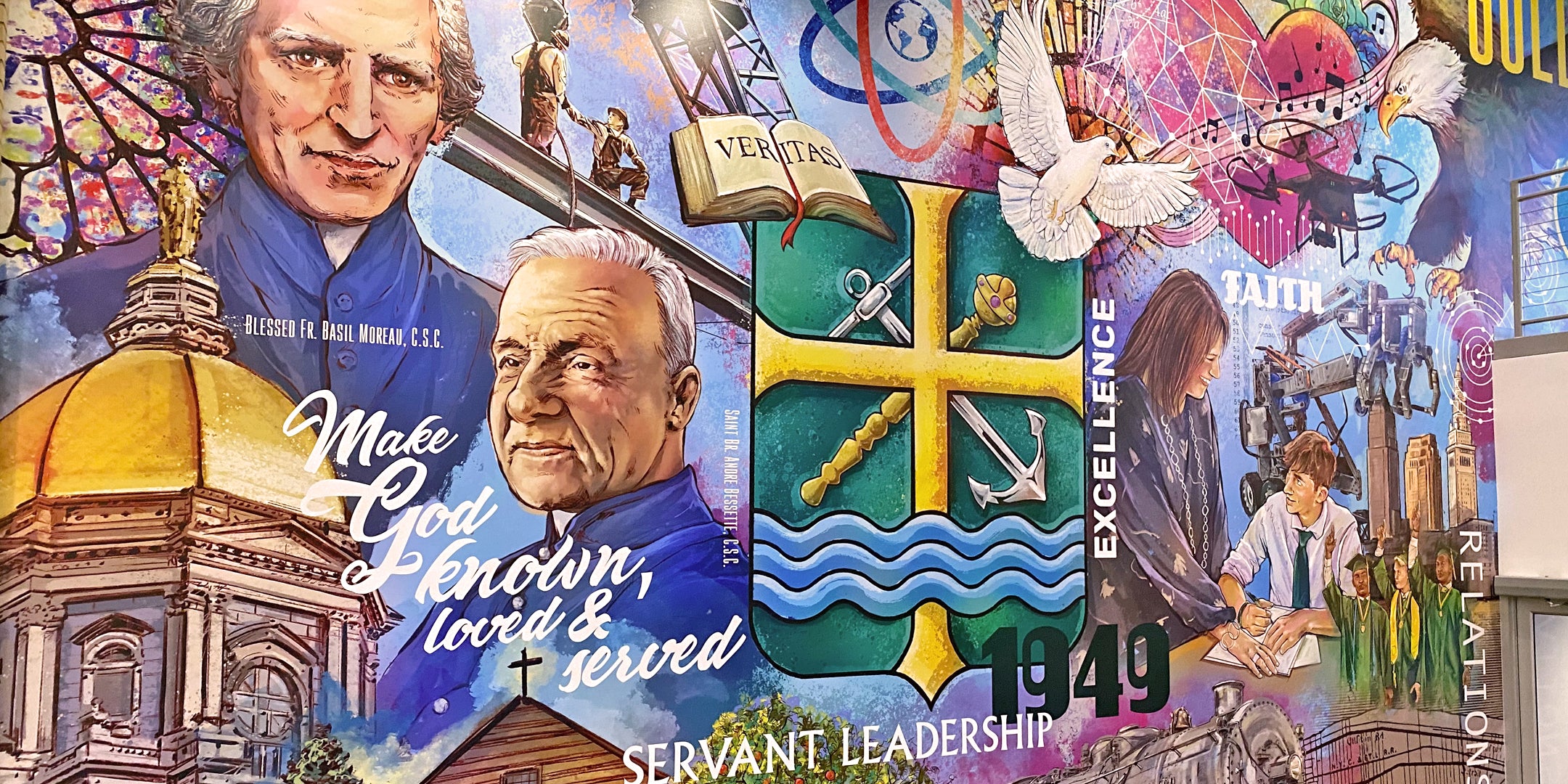 George was asked to create a mural for St. Edward high school’s new 15,000 square-foot expansion. The centerpiece of the new commons is an 18 foot mural by George that depicts the history of the holy cross and St. Edward High School. The mural highlights the important elements of the school as well as their commitment to developing the hearts and minds of their students.