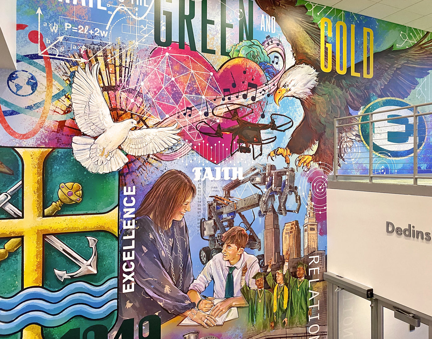 George was asked to create a mural for st. Edward high school’s new 15,000 square-foot expansion. The centerpiece of the new commons is an 18 foot mural by George that depicts the history of the holy cross and St. Edward High School. The mural highlights the important elements of the school as well as their commitment to developing the hearts and minds of their students.
