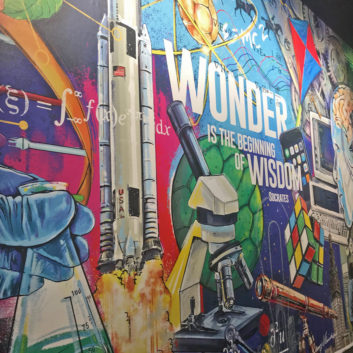 George was asked to create two murals that represent the right and left brain that leads you into the new innovation center at St. Edward High School. George wanted to incorporate fun ways to show both the creative side and analytical side of the human brain. Each time you look at it, George wanted there to be fun and new things to find and be a learning tool of things to discover as you walk into the classrooms there.