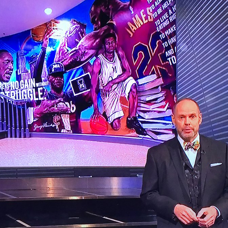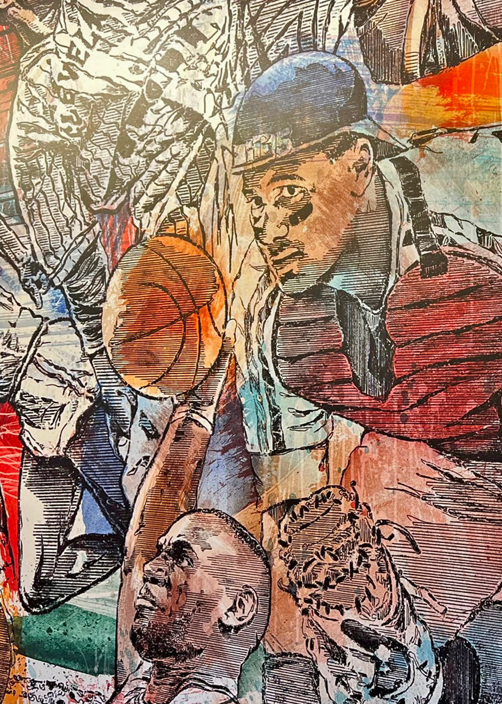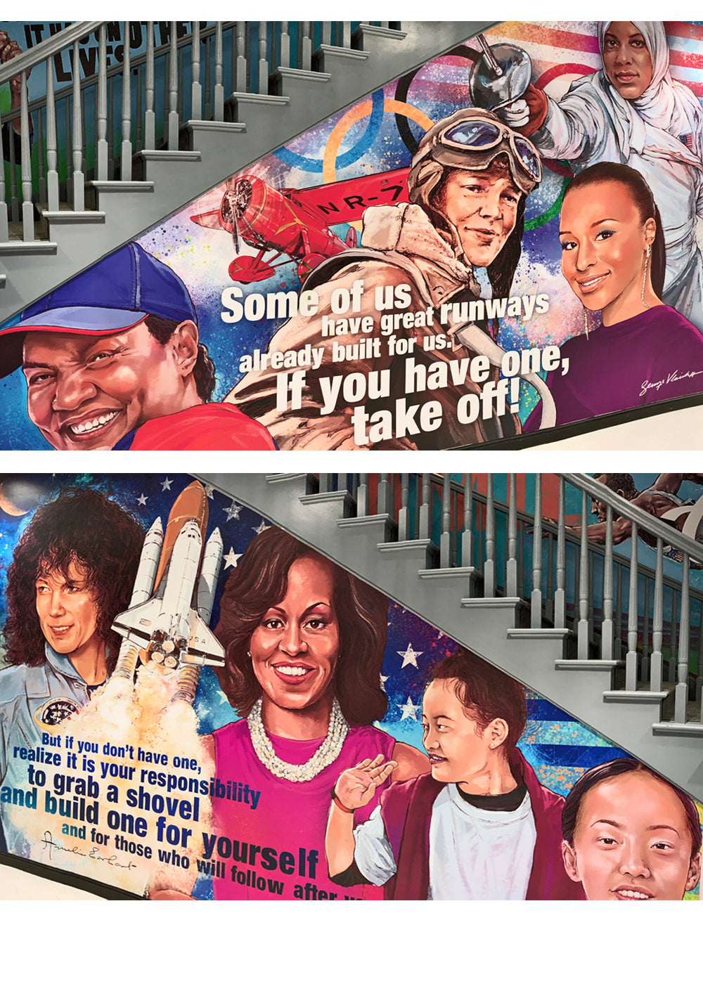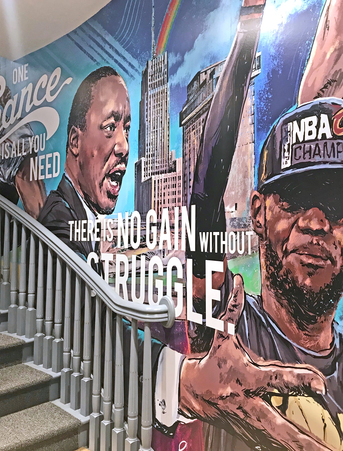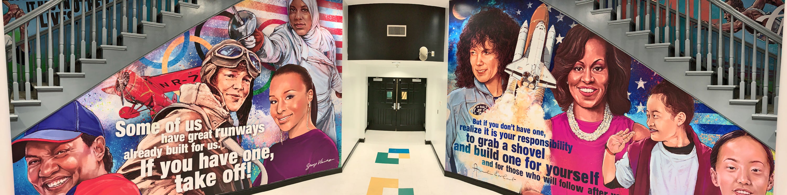 George was asked to create a mural that could serve as an inspiration for students. It has become a focal point for the school and backdrop for media appearances. The first mural showcases Lebron and iconic and historic figures that have influenced his life. The mural was such a hit, they asked George to create a second mural featuring prominent and inspirational women to the school.