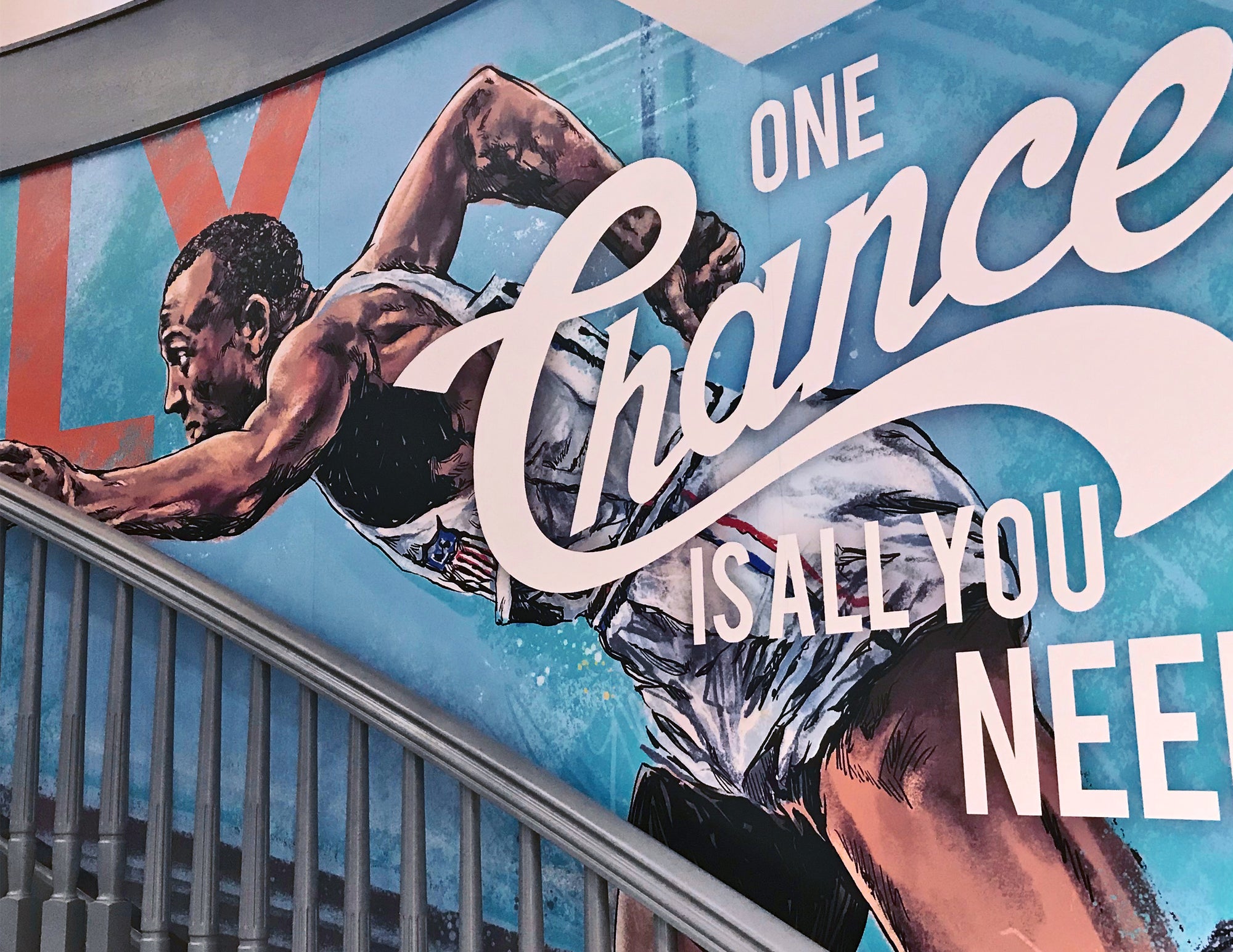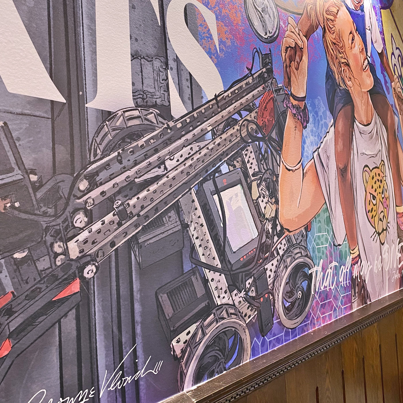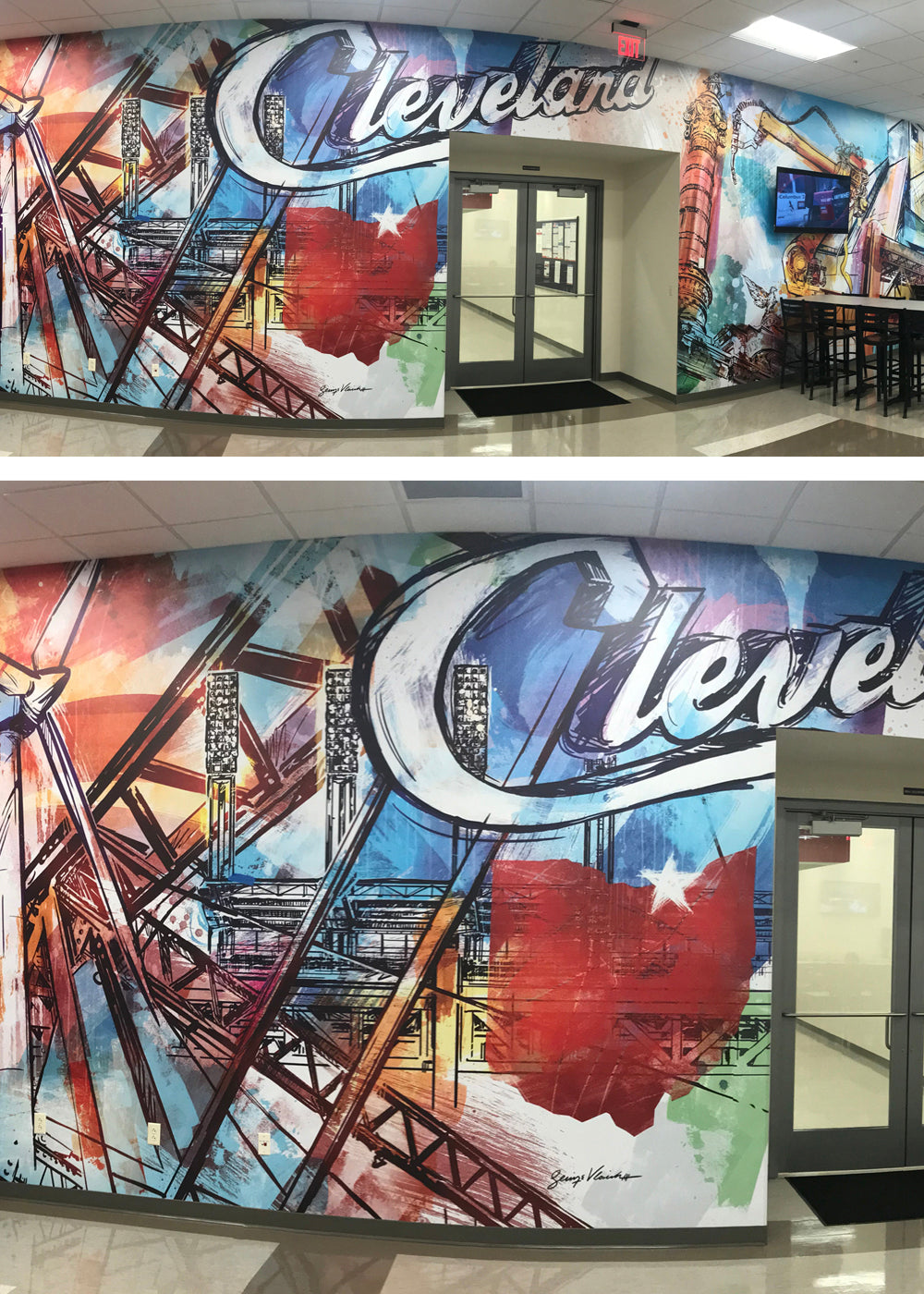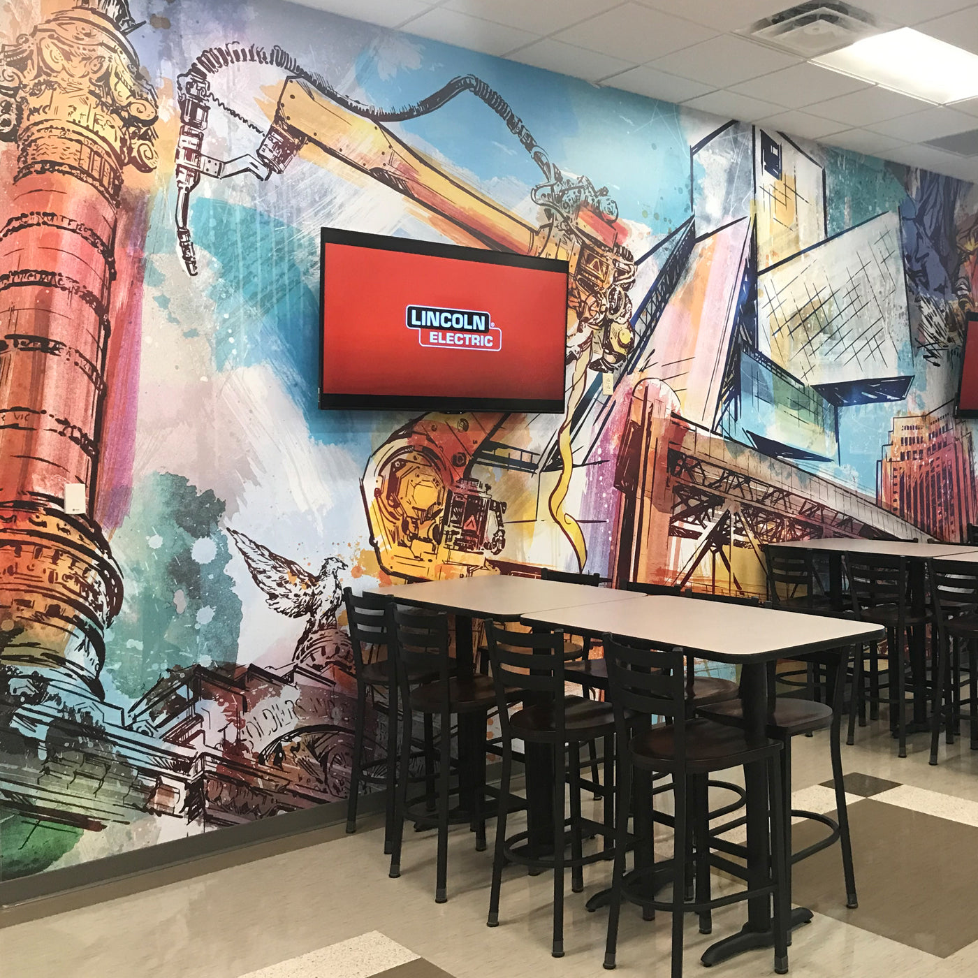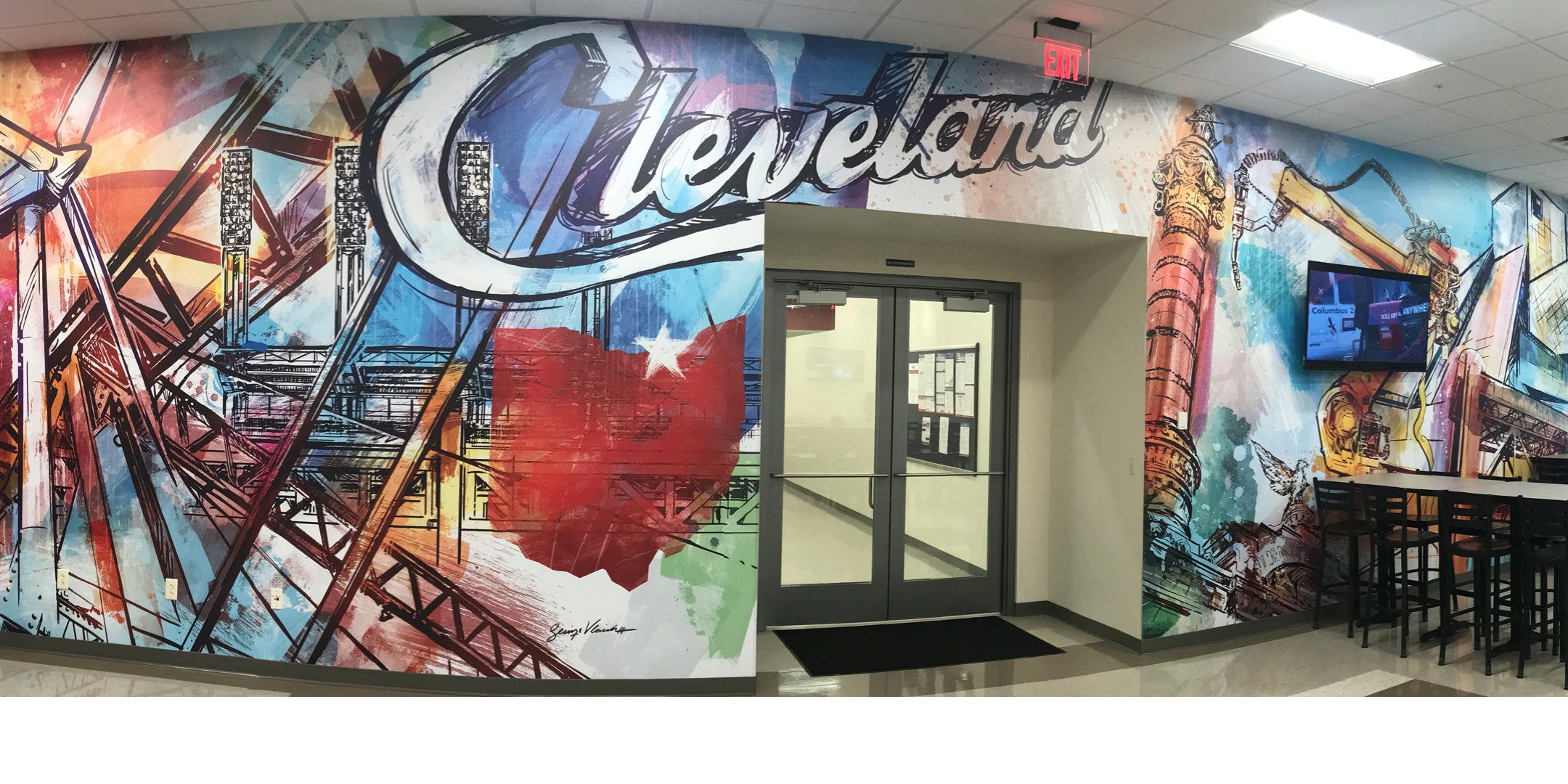 Lincoln Electric commissioned George to create a mural featuring what makes it unique and all the things that Lincoln Electric has helped make and build in and throughout Cleveland and Northeast Ohio. The mural completely transforms the space into a great room to host guests from around the world.